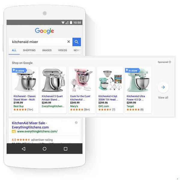 ● 当用户输入查询语句时,Google会查看商家提供的数据,并且他们的产品在与用户查询相关时自动参与竞价。