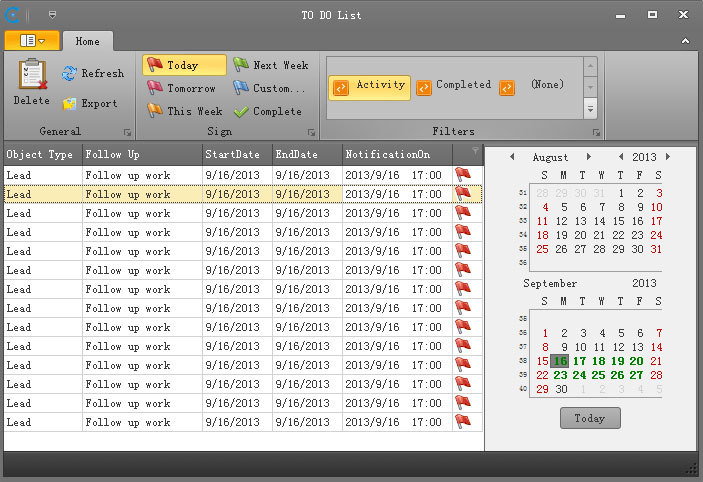 待办事项:潜在顾客和商业机遇提供了后续标识的功能,如果有些记录需要后续跟进,相关人员可以对其添加标识,设定提醒的时间,标识后的记录将作为事件存入到待办事项列表中。在待办事项列表中可修改提醒时间。