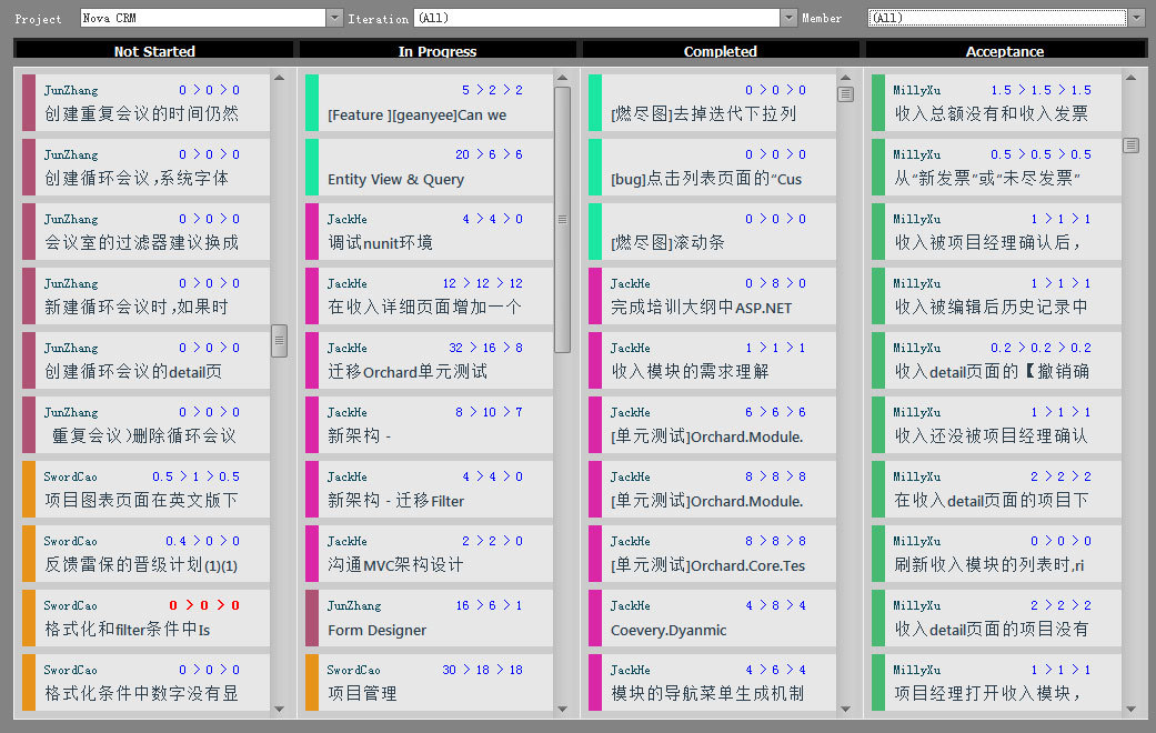 任务图表:任务图表通过看板的形式显示任务的完成状态,这里可以查看不同成员每个任务的计划工时、实际投入和有效产出。当实际投入和计划工时相差太大时系统会将数据高亮显示。